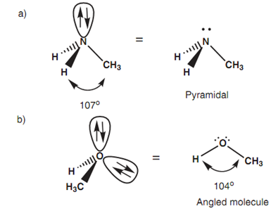 Figure: (a) Geometry of sp3 hybridized nitrogen; (b) geometry of sp3 hybridized oxygen.
