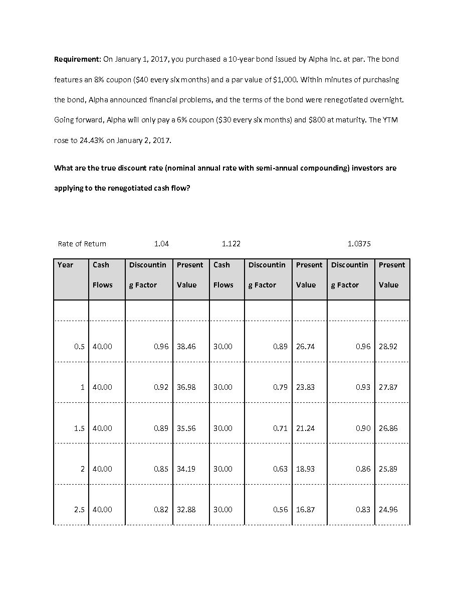 "Requirement: On January 1, 2017, you purchased a 10-year bond issued by Alpha Inc. at par. The bondfeatures an 8% coupon ($40 every six months) and a par value of $1,000. Within minutes of purchasingthe bond, Alpha announced financial problems, and ..