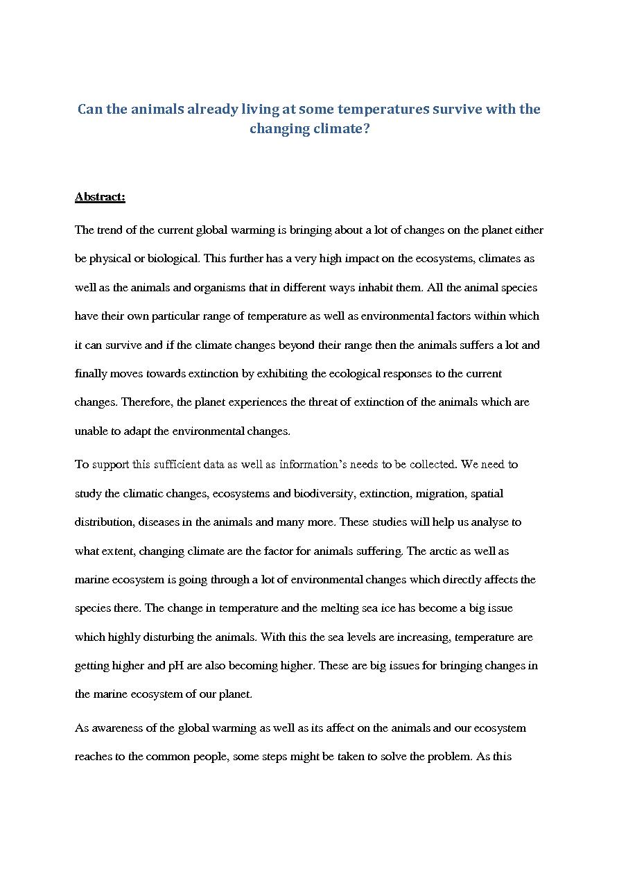 "Can the animals already living at some temperatures survive with thechanging climate?Abstract:The trend of the current global warming is bringing about a lot of changes on the planet eitherbe physical or biological. This further has a very high impa..