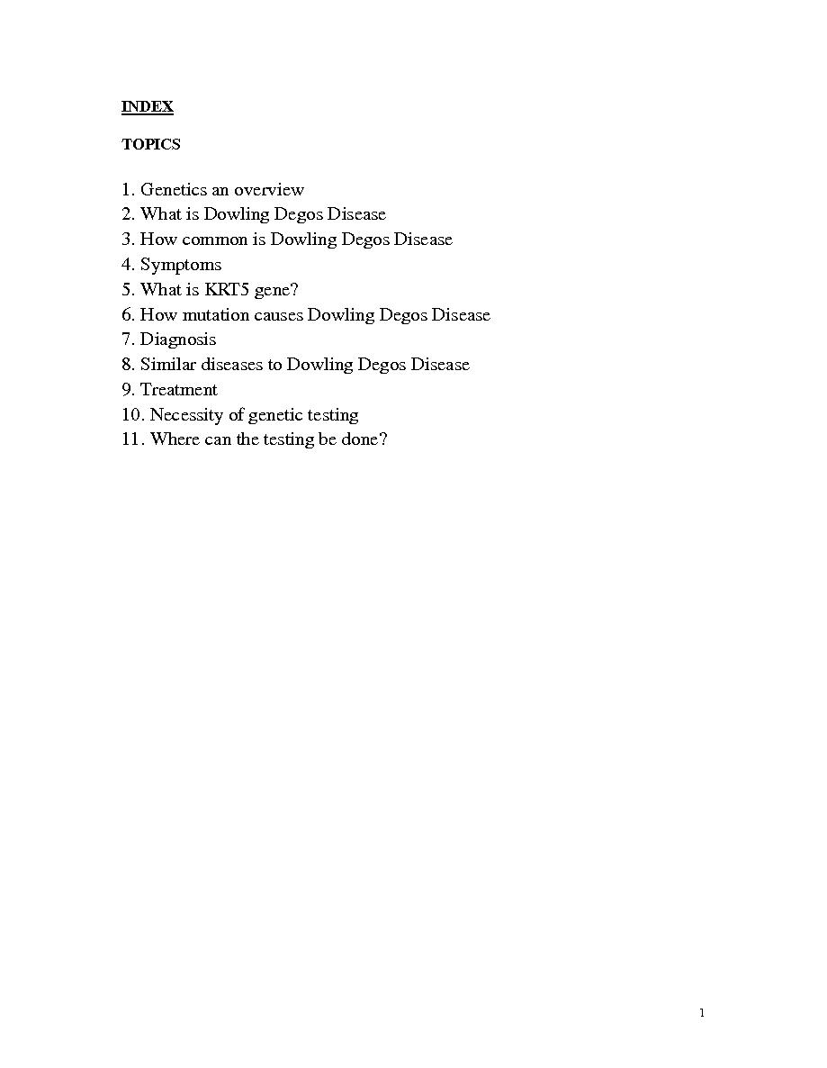 "INDEXTOPICS1. Genetics an overview 2. What is Dowling Degos Disease 3. How common is Dowling Degos Disease4. Symptoms 5. What is KRT5 gene? 6. How mutation causes Dowling Degos Disease 7. Diagnosis8. Similar diseases to Dowling Degos Disease 9. Trea..