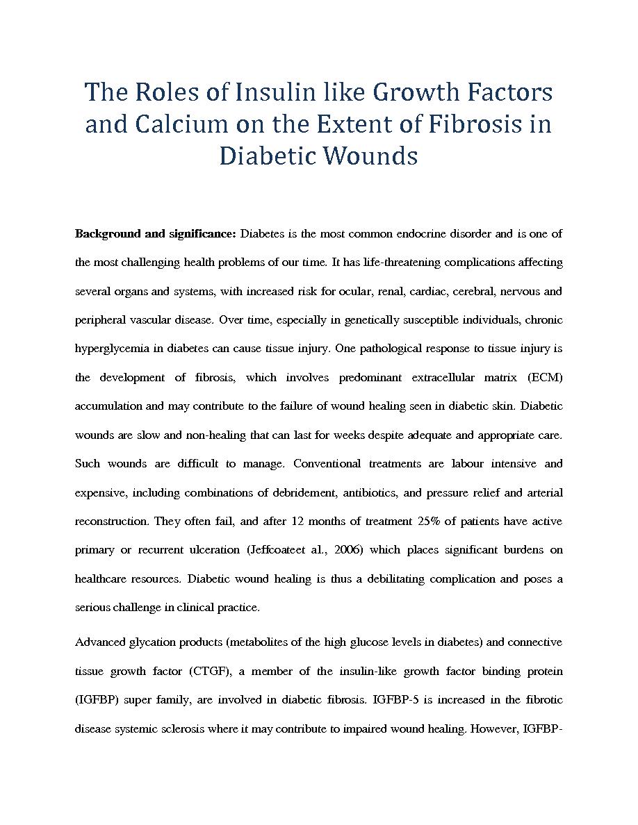 "The Roles of Insulin like Growth Factorsand Calcium on the Extent of Fibrosis inDiabetic WoundsBackground and significance: Diabetes is the most common endocrine disorder and is one ofthe most challenging health problems of our time. It has life-thr..