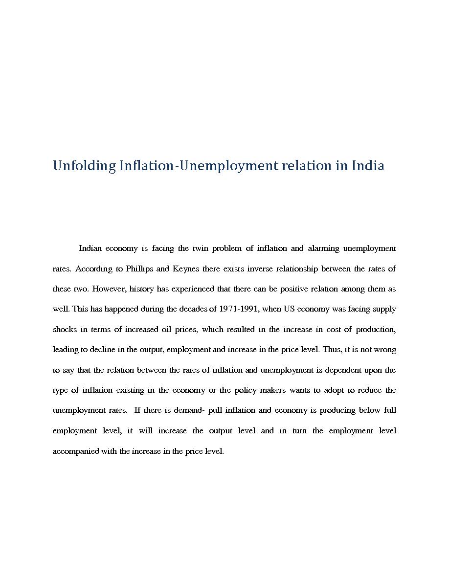 "Unfolding Inflation-Unemployment relation in IndiaIndian economy is facing the twin problem of inflation and alarming unemploymentrates. According to Phillips and Keynes there exists inverse relationship between the rates ofthese two. However, histo..