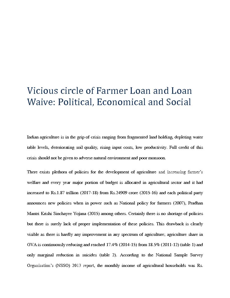 "Vicious circle of Farmer Loan and LoanWaive: Political, Economical and SocialIndian agriculture is in the grip of crisis ranging from fragmented land holding, depleting watertable levels, deteriorating soil quality, rising input costs, low productiv..