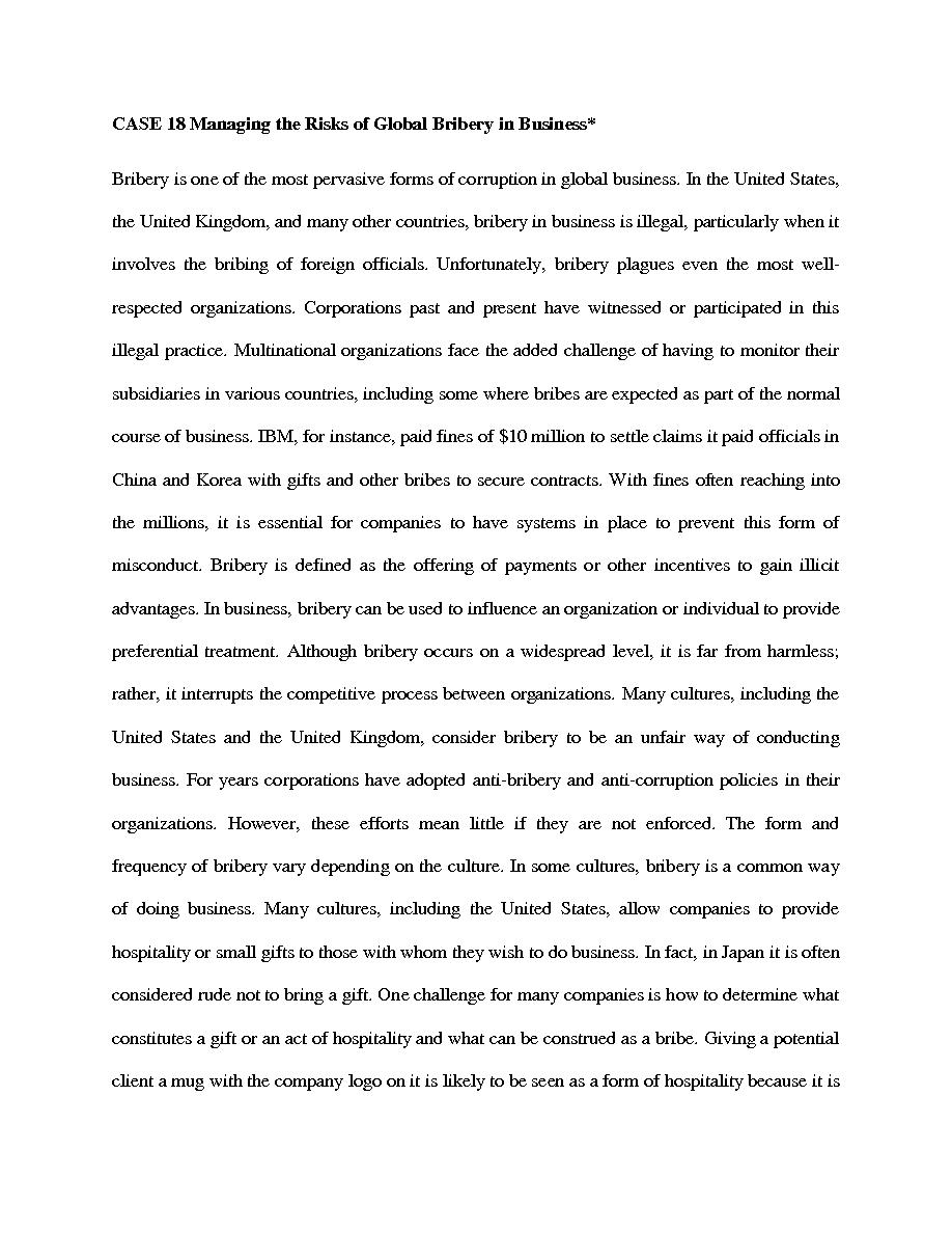 "CASE 18 Managing the Risks of Global Bribery in Business*Bribery is one of the most pervasive forms of corruption in global business. In the United States,the United Kingdom, and many other countries, bribery in business is illegal, particularly whe..