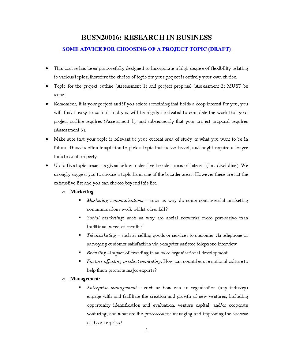 "BUSN20016: RESEARCH IN BUSINESSSOME ADVICE FOR CHOOSING OF A PROJECT TOPIC (DRAFT)• This course has been purposefully designed to incorporate a high degree of flexibility relatingto various topics; therefore the choice of topic for your project is e..
