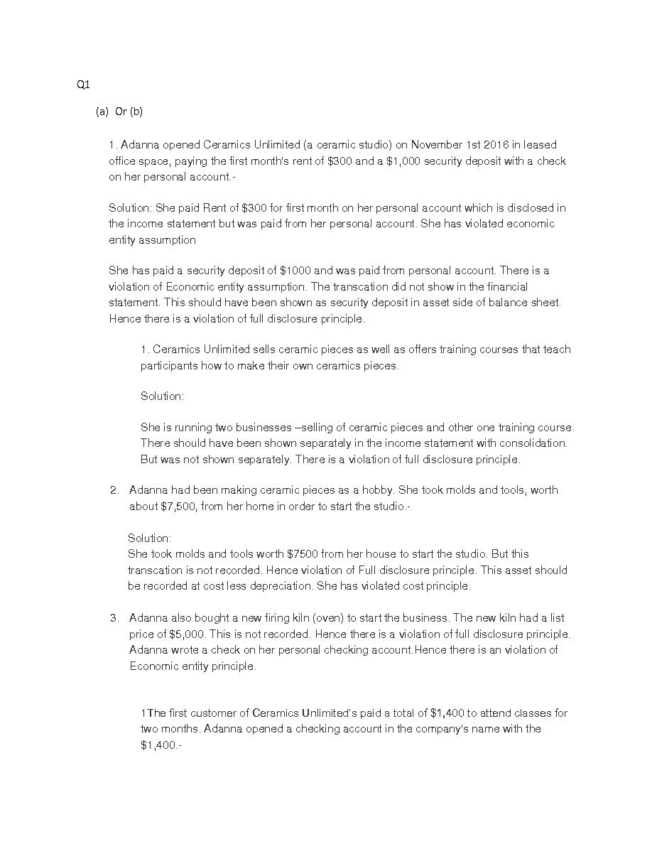 "Q1(a) Or (b)1. Adanna opened Ceramics Unlimited (a ceramic studio) on November 1st 2016 in leasedoffice space, paying the first month's rent of $300 and a $1,000 security deposit with a checkon her personal account.-Solution: She paid Rent of $3..