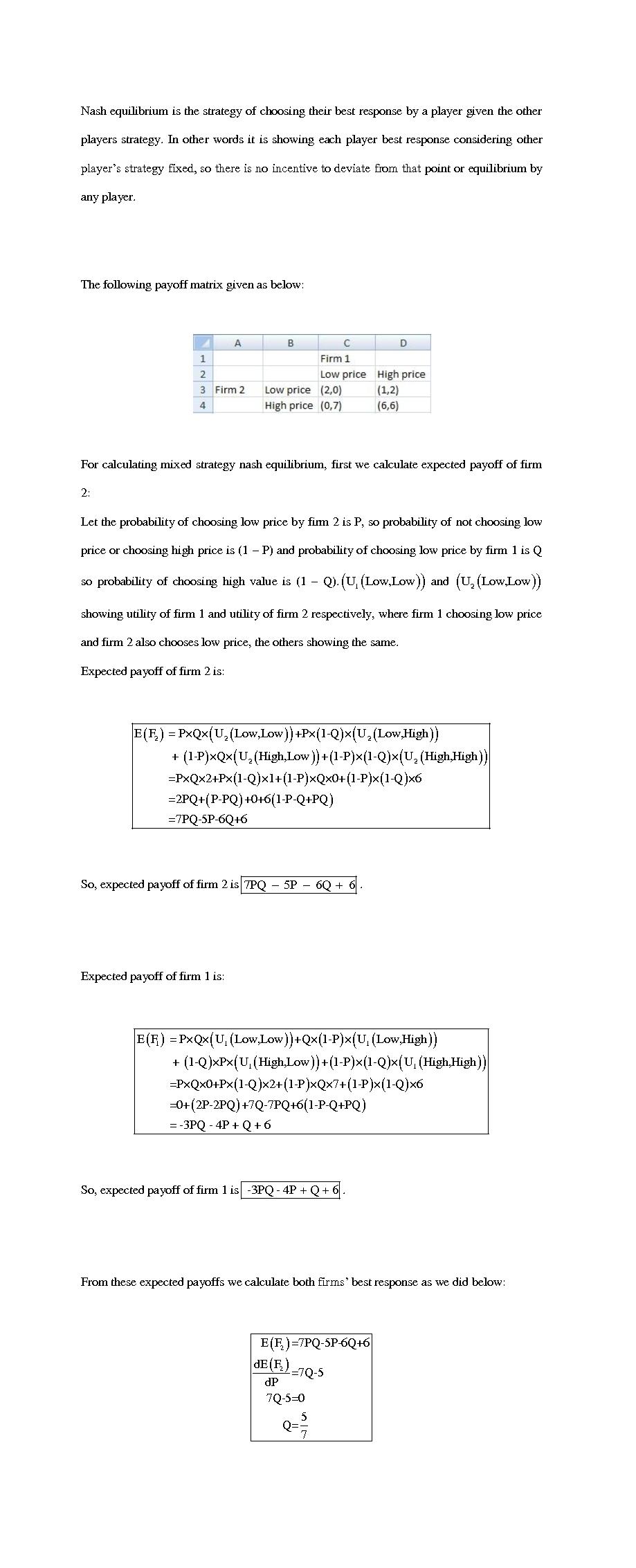 "Nash equilibrium is the strategy of choosing their best response by a player given the otherplayers strategy. In other words it is showing each player best response considering otherplayer’s strategy fixed, so there is no incentive to deviate from t..