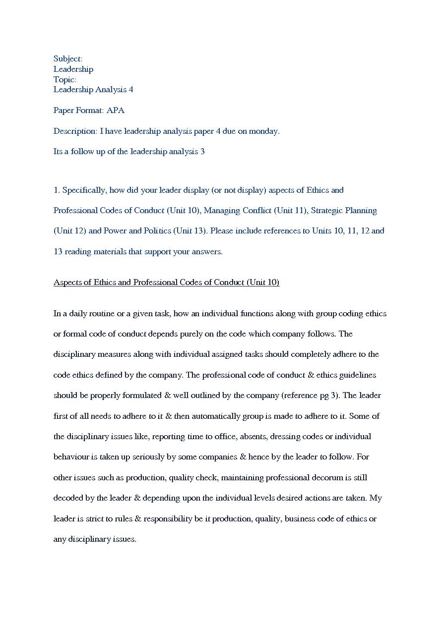 "Subject:LeadershipTopic:Leadership Analysis 4Paper Format: APADescription: I have leadership analysis paper 4 due on monday. Its a follow up of the leadership analysis 31. Specifically, how did your leader display (or not display) aspects of Ethics ..