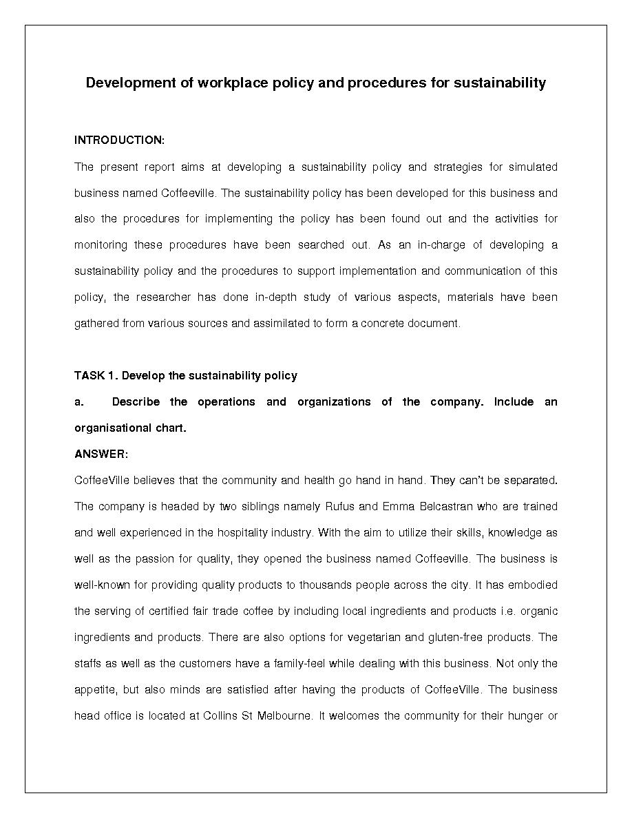 "Development of workplace policy and procedures for sustainabilityINTRODUCTION:The present report aims at developing a sustainability policy and strategies for simulatedbusiness named Coffeeville. The sustainability policy has been developed for this..