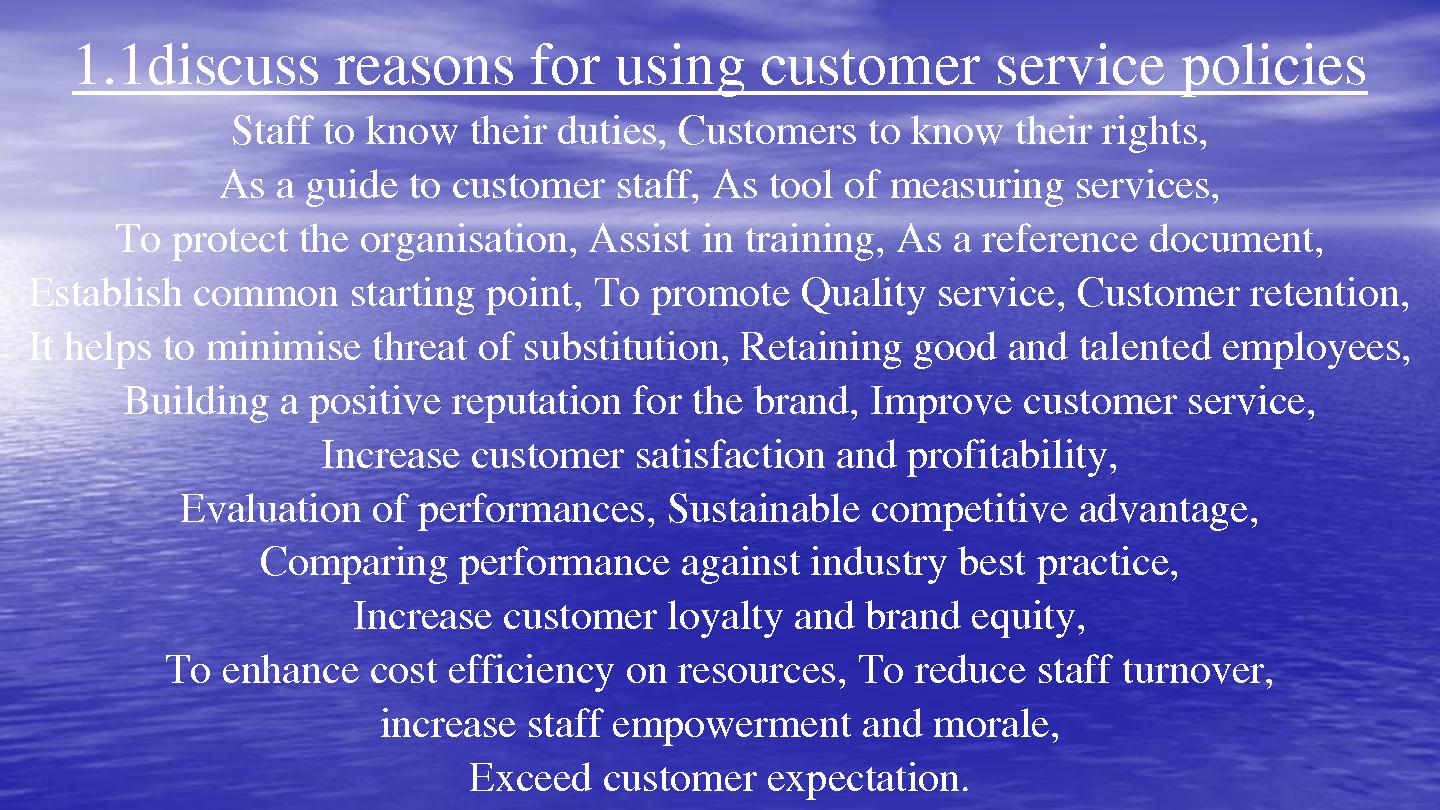 "1.1discuss reasons for using customer service policies Staff to know their duties, Customers to know their rights,As a guide to customer staff, As tool of measuring services,To protect the organisation, Assist in training, As a reference document,Es..