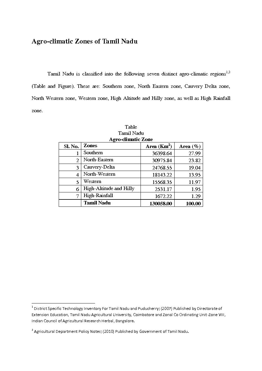 "Agro-climatic Zones of Tamil Nadu 1,2 Tamil Nadu is classified into the following seven distinct agro-climatic regions (Table and Figure). These are: Southern zone, North Eastern zone, Cauvery Delta zone, North Western zone, Western zone, High Altit..