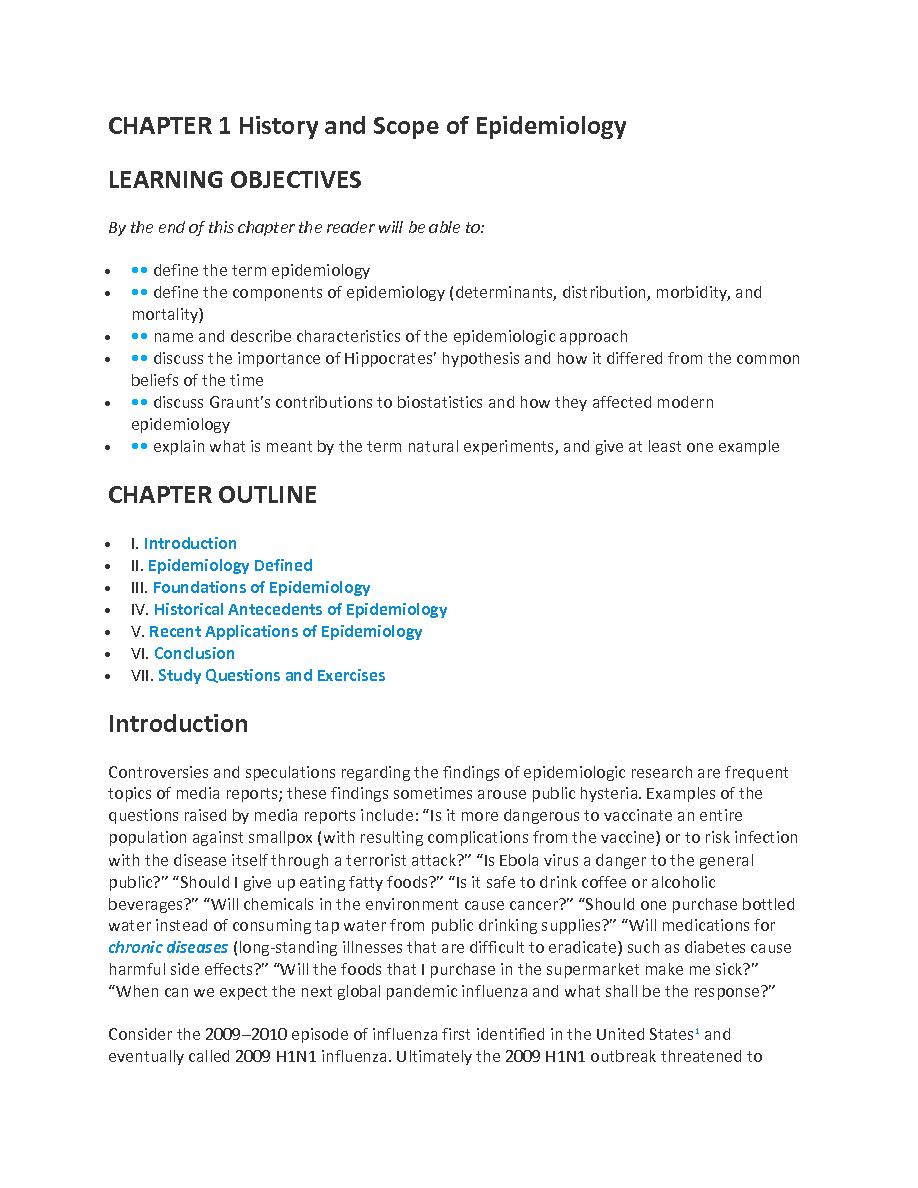 "CHAPTER 1 History and Scope of Epidemiology LEARNING OBJECTIVES By the end of this chapter the reader will be able to:? •• define the term epidemiology ? •• define the components of epidemiology (determinants, distribution, morbidity, andmortality) ..