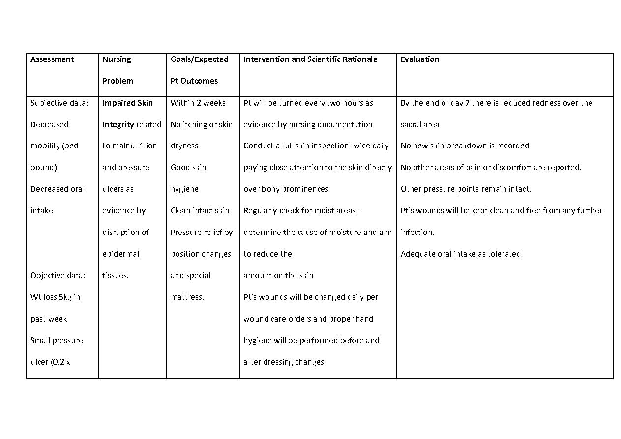 "Assessment Nursing Goals/Expected Intervention and Scientific Rationale EvaluationProblem Pt OutcomesSubjective data: Impaired Skin Within 2 weeksPt will be turned every two hours as By the end of day 7 there is reduced redness over the Decreased In..