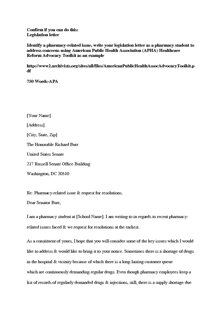 "Legislation letter\r\n\r\nIdentify a pharmacy-related issue, write your legislation letter as a pharmacy student to address concerns using American Public Health Association (APHA) Healthcare Reform Advocacy Toolkit as an example \r\n\r\nhttp://www2..
