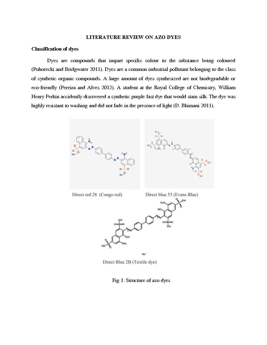 "LITERATURE REVIEW ON AZO DYESClassification of dyesDyes are compounds that impart specific colour to the substance being coloured(Pohorecki and Bridgwater 2011). Dyes are a common industrial pollutant belonging to the classof synthetic organic compo..