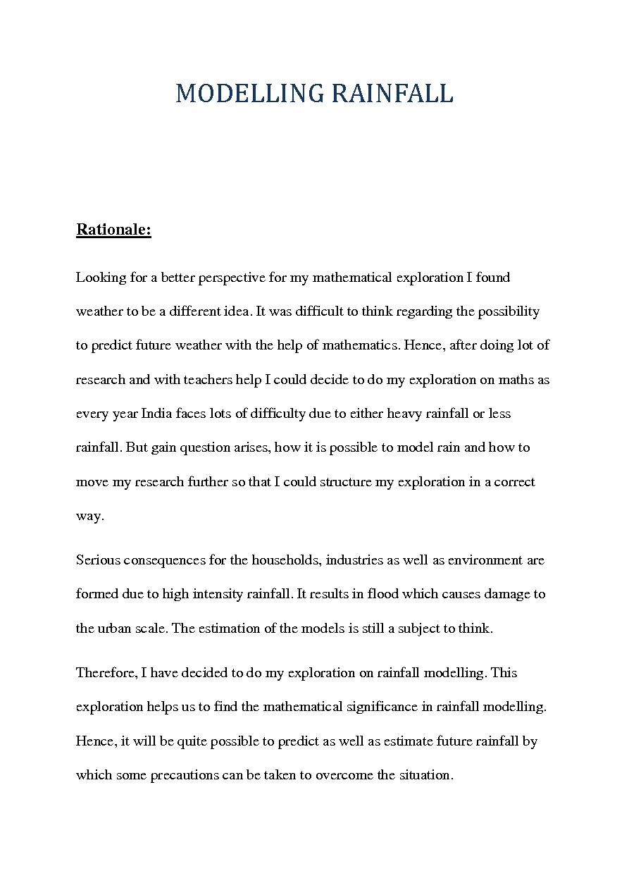 "MODELLING RAINFALLRationale: Looking for a better perspective for my mathematical exploration I foundweather to be a different idea. It was difficult to think regarding the possibilityto predict future weather with the help of mathematics. Hence, af..