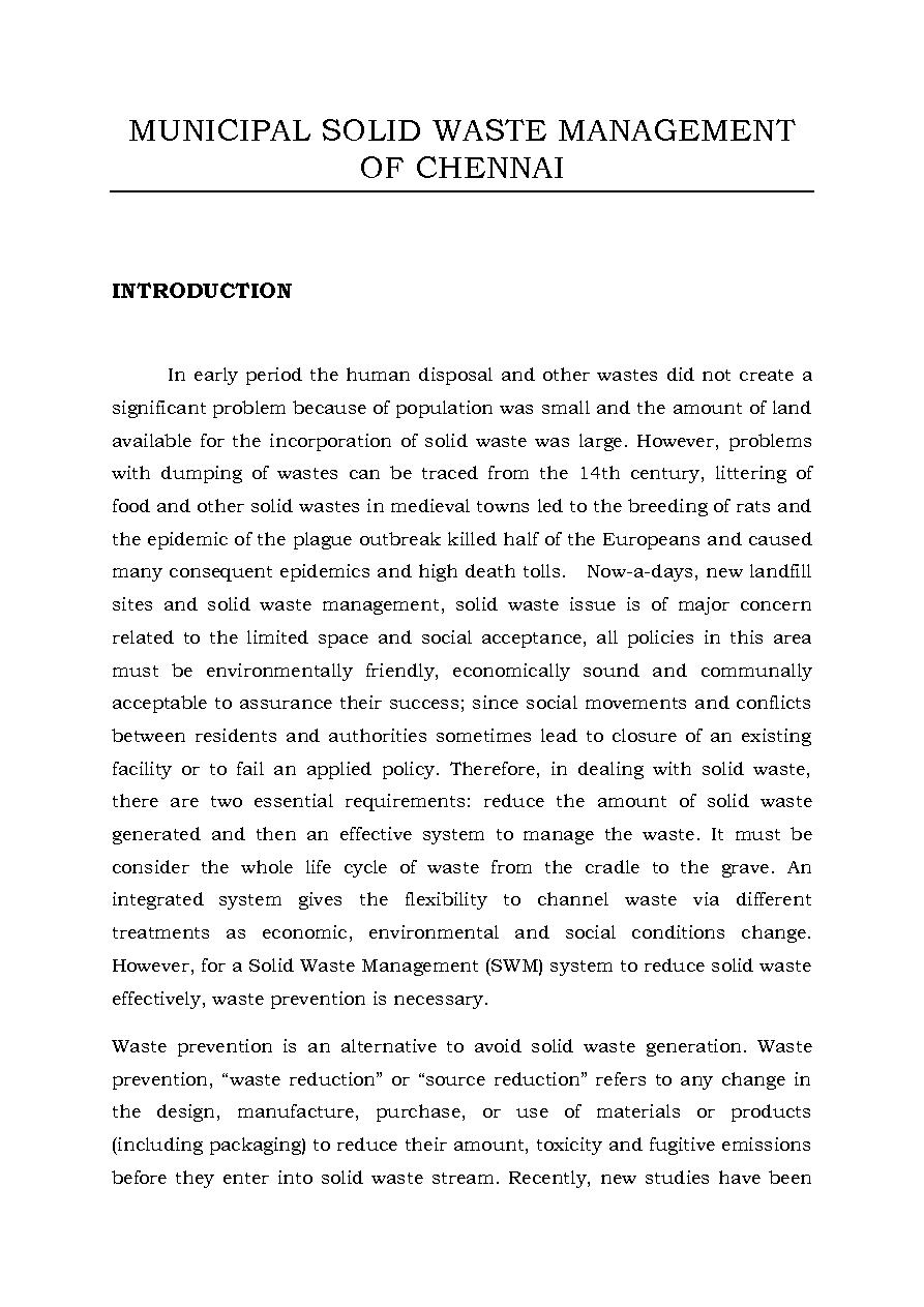 "MUNICIPAL SOLID WASTE MANAGEMENT OF CHENNAI INTRODUCTION In early period the human disposal and other wastes did not create a significant problem because of population was small and the amount of land available for the incorporation of solid waste w..