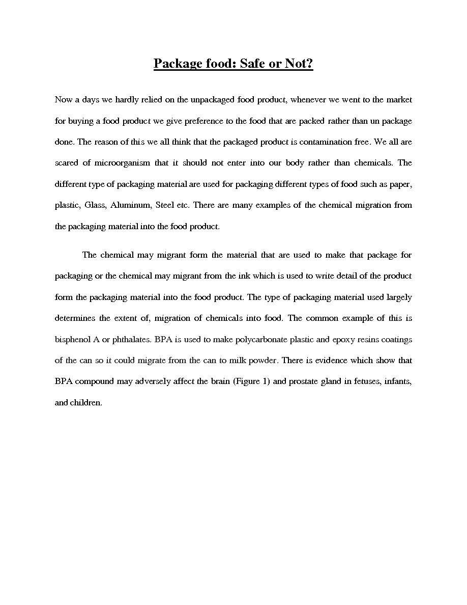 "Package food: Safe or Not?Now a days we hardly relied on the unpackaged food product, whenever we went to the marketfor buying a food product we give preference to the food that are packed rather than un packagedone. The reason of this we all think ..
