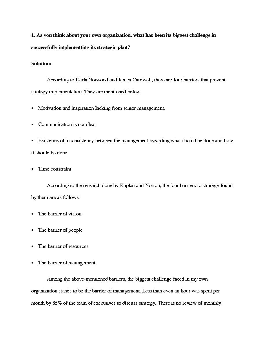 "1. As you think about your own organization, what has been its biggest challenge insuccessfully implementing its strategic plan?Solution:According to Karla Norwood and James Cardwell, there are four barriers that preventstrategy implementation. They..