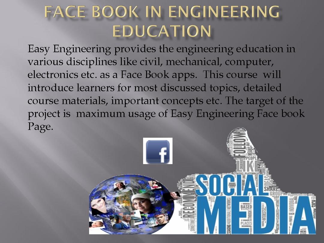 "Easy Engineering provides the engineering education invarious disciplines like civil, mechanical, computer,electronics etc. as a Face Book apps.This coursewillintroduce learners for most discussed topics, detailedcourse materials, important concepts..