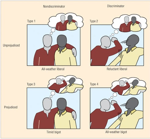 This is Merton's Typology about the relationship between prejudice and discrimination.
