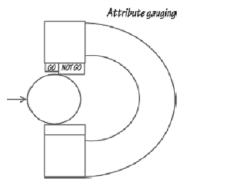 On the other hand, some processes have outputs with attributes to be controlled where counting the number of defects is more appropriate than measuring them. The outputs can be segregated into two categories (eg pass/fail or non-defective/defective). For example, in bottle production, the design requirement may stipulate a maximum allowable number of air bubbles in the glass. Bottles which have no more than this number of bubbles would be counted as non-defective items; bottles with more than this number would be counted as defective items. Returning to the example of controlling the diameters of discs, it might be decided, perhaps for reasons of economy, that it is more appropriate to gauge the diameters rather than measure them. This figure shows how this can be achieved by use of a simple go/not-go gap gauge. Conforming discs, as shown in this figure, will be small enough to enter the 'go' gap, but too large to enter the 'not go' gap. As a result the output will be segregated into countable 'pass' and 'reject' groups.