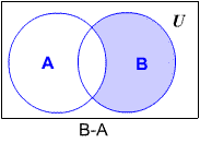 The complement of A relative to B, written B - A, is the set of all elements in B that are not in A. This can be written as B - A = { x| x ∈ A or x ∈ B }.