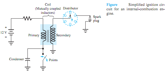 Ignition systems in automobiles have been designed as a straightforward application of electrical transients. Figure shows a simplified ignition circuit for an internal-combustion engine. The primary inductance, current-limiting resistance, and capacitance forman underdamped series RLC circuit. Thus, when the points open, an oscillatory current flows through the primary, thereby inducing the required voltage in the secondary. The points form a switch, which opens and closes as the engine rotates, exactly at the instantwhen an ignition spark is needed by one of the cylinders. During the period when the points are closed, current builds up rather slowly in the primary winding of the coil, which consists of a pair of mutually coupled inductors, as shown in Figure. The current is interrupted rapidly when the points open. The resulting large rate of change of current induces a large voltage across the coil secondary, which is connected to the appropriate spark plug by the distributor. The resistance limits the current in case the engine stops with the points closed. Since the voltage across a capacitance cannot change instantaneously, the capacitor prevents the voltage