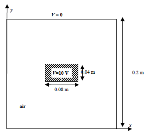 Figure shows the cross-section of an electrostatic problem with translational symmetry: a rectangular coaxial cable. The inner conductor is held at 10 volts and the outer conductor is grounded. (This is similar to the system considered in Question 3, Assignment 1.)