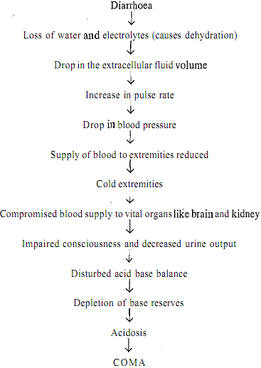 All of us must have suffered from diarrhoea at least once in our lifetime. How do you feel thereafter? Well most of us must have experienced weakness, dizziness, dryness of mouth and anorexia. Our skin also becomes dry and loose. During diarrhoea the stools are loose and have high water content - an indicator that water is being lost in higher than normal amounts. The stools also contain a high amount of: electrolytes due to enhanced peristaltic movements i.e. increased movements of the stomach and inteslines. This results in the deficiency of water and electrolytes in the body which is referred to as dehydration. Dehydration results in reduction in the extracellular blood volume and hence a reduction in the total blood volume which is often referred to as hypovolemia. Low blood volume is associated with hypotension and a low cardiac output. In response to hypotension, the heart tries to compensate by increasing the number of cardiac cycles per minute which is indicated by a high pulse rate. You will often find that during diarrhoea the patients have low blood pressure but usually a higher than normal pulse rate. As the severity of dehydration increases, despite enhanced cardiac? Cycles, adequate amount of blood and nutrients do not reach all body parts/organs. The patient is therefore cold to touch at the extremities. Another complication that may arise if severe dehydration does not receive prompt medical care is ischemic damage to the tissues of various organs due to reduced supply of oxygen and nutrients. Of most significance is damage to the kidneys and brain. Reduced blood volume results in reduced glomerular filtration rate and hence a low urine output. This in turn can 'result in accumulation of toxic waste products in the blood which can be measured by the level of blood urea nitrogen levels. Other associated changes can be observed in the form of azotemia - abnormal high level of urea and creatinine and metabolic acidosis which develop during acute renal failure. Acute renal failure is particularly observed during severe diarrhoea coupled with delayed or absence of adequate fluid management. Another consequence, which we were discussing, involved changes in the nervous system. They can be as mild as dizziness due to less supply of oxygen, glucose and other nutrients to the brain cells or as severe as resulting in coma due to excessive accumulation of nitrogenous waste products and other toxic metabolites in the blood. It would thus be evident that maintenance of adequate blood volume is imperative to prevent dehydration and its consequences some of which call be life threatening.