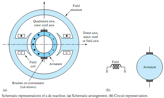 In the conventional dc machine (with a closed continuous commutator winding on its armature), for example, full-wave rectification of the alternating voltage induced in individual armature coils is achieved by means of a commutator, which makes a unidirectional voltage available to the external circuit through the stationary carbon brushes held against the commutator surface.The armaturewindings of dcmachines are located on the rotor because of this necessity for commutation and are of the closed continuous type, known as lap and wavewindings. The simplex lap winding has as many parallel paths as there are poles, whereas the simplex wave winding always has two parallel paths. The winding connected to the commutator, called the commutator winding, can be viewed as a pseudostationary winding because it produces a stationary flux when carrying a direct current, as a stationarywindingwould. The direction of the flux axis is determined by the position of the brushes. In a conventional dc machine, in fact, the flux axis corresponds to the brush axis (the line joining the two brushes). The brushes are located so that commutation (i.e., reversal of current in the commutated coil) occurs when the coil sides are in the neutral zone, midway between the field poles. The axis of the armature mmf is then in the quadrature axis, whereas the stator mmf acts in the field (or direct) axis. Figure shows schematic representations of a dc machine. The commutator is thus a device for changing the connections between a rotating closed winding and an external circuit at the instants when the individual coil-generated voltages reverse. In a dc machine, then, this arrangement enables a constant and unidirectional output voltage. The armature mmf axis is fixed in space because of the switching action of the commutator (even though the closed armature winding on the rotor is rotating), so the commutator winding becomes pseudostationary.