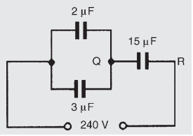 A 4μF capacitor is connected in parallel with a 6μF capacitor. This arrangement is then linked in series with a 10μF capacitor. A supply p.d. of 250V is linked across the circ