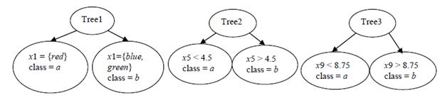 Given a dataset with 1000 rows and 25 predictors labeled x1, x2, ...,x25 to classify into two classes {a, b}. Consider the small random forest with 3 trees and one split in each tree as shown below. Here 5 predictors are selected randomly at each node. The class assigned to each leaf node is also shown.