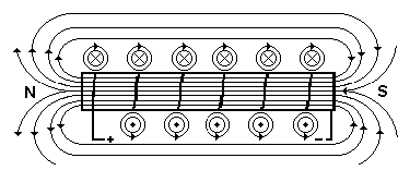 If a length of wire is bent into a series of loops, it forms a solenoid. The direction of the magnetic field around any small part of it can be obtained by using the corkscrew rule. If the fields for a series of such loops are combined, the result will be a field pattern similar to that of a bar magnet.