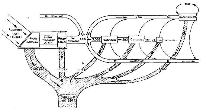 It shows that most of the energy input is in the form of solar radiation while the output of energy is represented by the waste heat dissipated from the system. It may be observed that the total energy input amounts to 410486 kcal/m2/yr (410,000 kcal/m2 solar energy and 486 kcal/m2/yr in the form of organic matter imported into the system) matches with the output of energy (407986 kcal/m2/yr) lost as waste heat and (2500 kcal/m2/yr exported from the system in the form of organic matter).