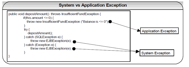 A System Exception is given by the system and is not recoverable. Because the System Exceptions are unpredictable when they occur, the EJB container is the only one responsible for trapping the System Exceptions. The container usually wraps any RuntimeException in RemoteException, which subsequently puts thrown to the caller. In addition to intercepting System Exception the container can give the errors.