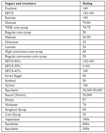Table: The relative sweetness of the various sweeteners. It is the standard to compare the sweetness of a product to sucrose. Sucrose is 100 and is the standard for comparison.