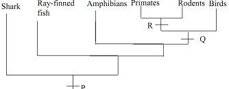 Evolutionary relationship among various animal groups is depicted in the cladogram given below. P, Q and R respectively shown: