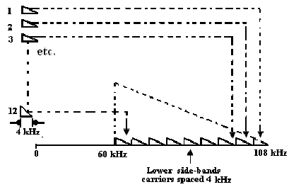 The bandwidth of a telephone speech signal is quite less than 4 kHz. Where, the available bandwidth on unloaded cables pair is fine above 100 kHz. Therefore this is possible, by using modulation techniques, for divide up the cable bandwidth then a number of telephone speech paths can be carried at the same time along a single cable pair. The normal arrangement contains 24 telephone channels per cable pair, the modulation in 24 channels being carried out within the two stages. In the primary stage, 12 channels are multiplexed together to form that is commonly termed as a basic group. This basic group arrangement is demonstrated in figure. Each of the 12 telephone signals are single side-band amplitude modulated on to carriers spaced at 4 kHz intervals 64 kHz to 108 kHz. The lower side-band (LSB) is utilized in every case. The 12 base-band signals are thus translated in the frequency band from 60 kHz 108 kHz as demonstrated. The block diagram for the channel translating equipment is specified in figure. To form a 24-channel system, to basic groups are occupied together. One basic group (B) is transmitted directly as this stands. Another basic group (A) is amplitude modulated on to a carrier are 120 kHz and the lower side-band is occupied such as to take the frequency range from 12 kHz to 60 kHz as demonstrated in figure. by using two stages of modulation for basic group A, this is possible to decrease the physical size of the component needed for the LSB filters of the figure, because the lowest cut- off frequency needed is at 64 kHz quite than 12 kHz when the whole block of 24 channels were assembled together in one stage of modulation.