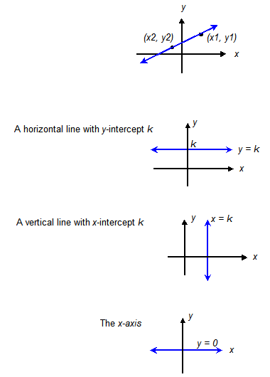 An equation whose graph is a line is called a linear equation. Here are listed some special forms of linear equations. Why should you know these? First, because you will often be using equations like this, and you will need to visualize their graphs. Second, because often you might know something about a line (like its slope, or its x-intercept), and need to be able to write down the equation.