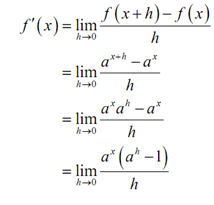 Now let's notice as well that the limit we've got above is accurately the definition of the derivative of f ( x ) = a x at x = 0 , i.e. f ′ (0) . Thus, the derivative becomes,