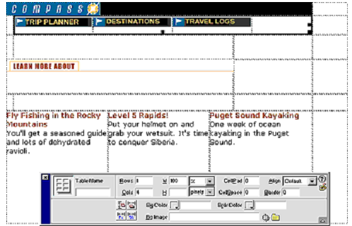 In Document window a border appears around the navigation button table, and Property inspector now reflects properties for a table.
