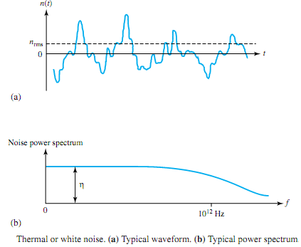 The spectrumof thermal noise power is uniformly spread over frequency up to the infrared region around 1012 Hz, as shown in Figure (b). Such a distribution indicates that n(t) contains all electrical frequencies in equal proportion, and an equal number of electrons is vibrating at every frequency. By analogy to white light, which contains all visible frequencies in equal proportion, thermal noise is also referred to as white noise.