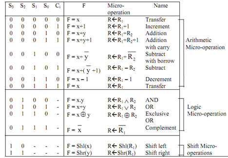 Please note that in Figure below arithmetic micro-operations have both S3 and S2 bits as zero. Input Ci is significant for only arithmetic micro-operations. For logic micro-operations S3, S2 values are 01. Values 10 and 11 cause shift micro-operations.