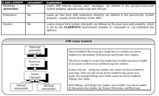 Class loaders in the hierarchy can never reload the class again. Hence difference is maintained. Classes loaded by a child class loader have visibility into classes loaded by its parent classes up the hierarchy but the reverse is not true illustrate in the above diagram.