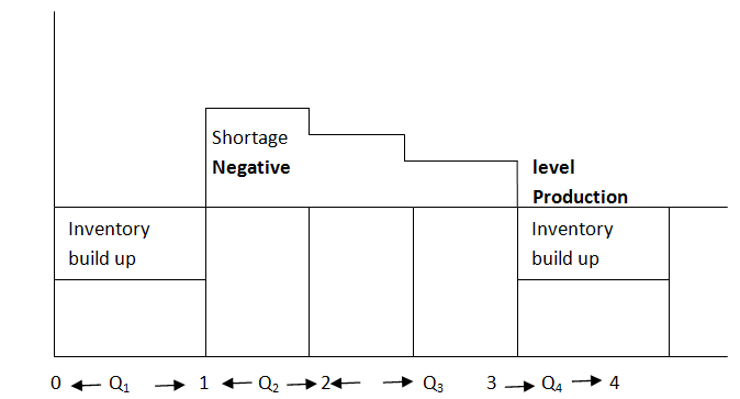 Figure shows the level capacity plan of a company manufacturing a product on produce to stock and sell basis. In the first quarter aggregate demand is less than production and inventory builds up till the end of the First Quarters . in the second third and fourth quarters are inventory levels Decline because production is less than the aggregate demand. In the fifth Quarter the production is more than the aggregate demand and hence Inventory builds up again.