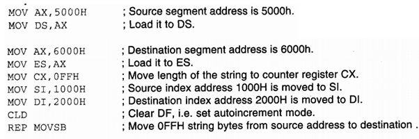MOVSW/MOVSB : Move String Word or String Byte: Imagine a string of bytes, stored in a set of consecutive memory locations is to be moved to another set of the destination locations. Starting byte of the source string is located in the memory location whose address can be computed by using DS (data segment) and SI (source index) contents. Starting address of the destination locations where this string has to be relocated is given by ES (extra segment) and Dl (destination index) contents. Starting address of the source string is 10H*DS+[SI], whereas the starting address of the destination string is 10H*ES+[DI]. The MOVSB/MOVSW instruction therefore, moves a string of bytes/ words pointed to by DS: SI pair (source) to the memory location pointed to by ES: Dl pair (destination). The REP instruction prefix is utilized with MOVS instruction to repeat it by a value given in the register counter (CX). The length of word string or byte string ought to be stored in register CX register. Flags are remaining unaffected by this instruction.