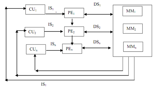In this categorization, numerous processing elements and multiple control units are ordered as in MISD. However the difference is that now in this organization multiple instruction streams function on multiple data streams. So, for handling multiple processing elements, several instruction streams and multiple control units are organized in such a way that multiple processing elements are controlling multiple data streams from main memory as shown in Figure below. The processors work on their individual data with their individual instructions. Tasks performed by various processors can begin or complete at different times. They aren't lock-stepped as in SIMD computers although run asynchronously. This categorization exactly identifies the parallel computer. Which means in real sense MIMD organisation is said to be a Parallel computer. All multiprocessor organizations fall under this categorization. Illustrations include; Burroughs D825, C.mmp, Cray-2, S1, Cray X-MP, Tandem/16, HEP, Pluribus, IBM 370/168 MP, Univac 1100/80, IBM 3081/3084, C.m*, BBN Butterfly, Meiko Computing Surface (CS-1), FPS T/40000, iPSC.