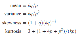 Negative binomial distribution is the probability distribution of number of failures, X, before the kth success in the sequence of Bernoulli trials where the probability of success at each trial is p and probability of failure is q =1-p. The distribution can be given as follows The mean, skewness, variance, and kurtosis of the distribution are as follows: Often used to model over the dispersion in count data.