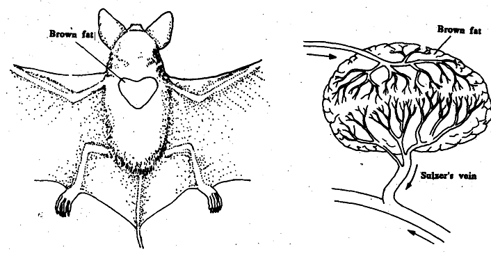 The brown adipose tissue contains great numbers of mitochondria and is richly vascularised. Release of norepinephrine into the tissue by the sympathetic nervous system results in a great increase in oxidation of lipid and release of heat. Brown fat, like nonshivering thermogenesis is specially prominent in new born individuals, hibernators and cold acclimated adult mammals. The brown fat tends to occur in discrete masses, located in the neck, interscapular region, axillae and abdomen. Among hibernators brown fat is believed to help in rewarming the body during emergence from hibernation. New born mammals use brown fat in routine thermogenesis. The principal mechanism of heat production by brown fat is by uncoupling the oxidative phosphorylation that occurs in the mitochondria. Thus, oxidation of food-stuffs results in the production of heat.